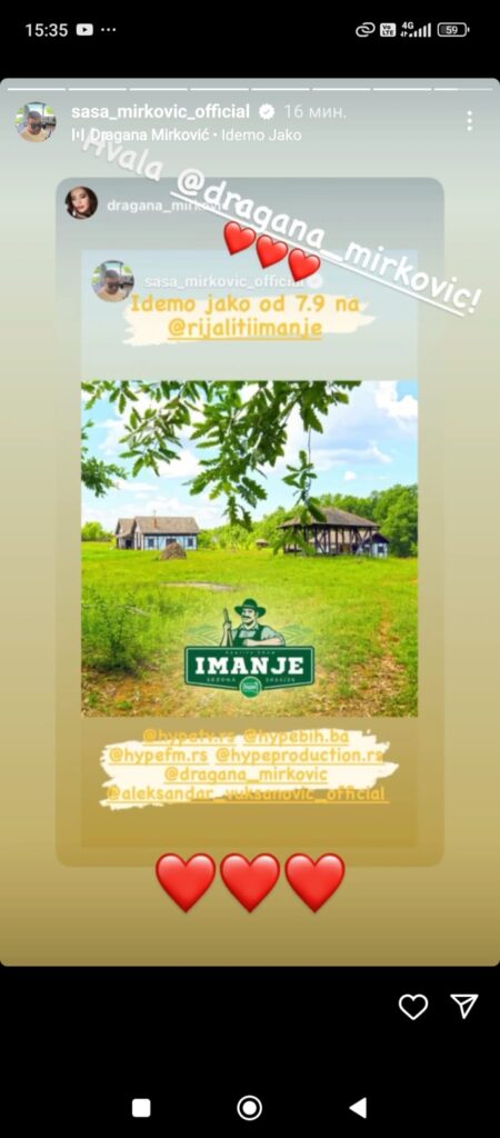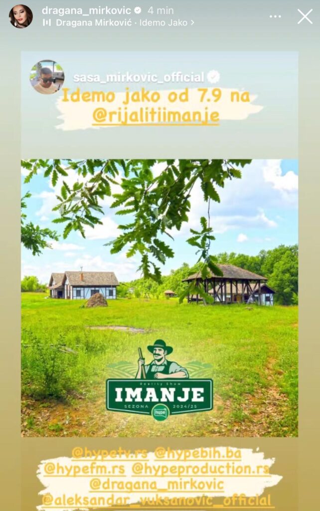 Naime, ona je „ripostovala“ stori Saše Mirkovića vezan za rijaliti „IMANJE“, čime je jasno potvrdila svoju podršku ovom konceptu i time još jednom demonstrirala svoju posvećenost razvoju kreativnih ideja u našoj zabavnoj industriji.