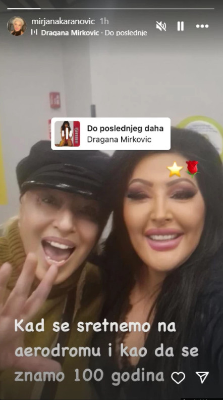 Naime, njih dve su se srele na beogradskom aerodromu „Nikola Tesla“ i odmah su podelile radost tog susreta. Mirjana je odlučila da zabeleži ovaj poseban trenutak, pa je tako podelila na svom storiju njihovu zajedničku sliku. Na slici se vidi kako obe dame ne skidaju osmehe sa lica, što je jasan pokazatelj koliko su bile srećne zbog ovog susreta.