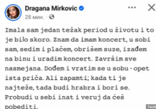– Imala sam jedan težak period u životu i to je bilo skoro. Znam da imam koncert, u sobi sam, sedim i plačem, obrišem suze, izađem na binu i uradim koncert. Završim sve nasmejana. Dođem i vratim se u sobu – opet ista priča. Ali zapamti, kada ti je najteže, tada budi hrabra i bori se. Probudi u sebi inat i veruj da ćeš pobediti – napisala je Dragana na svom Fejsbuk nalogu.