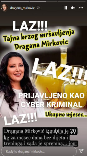 – Laž! Prijavljeno kao sajber kriminal – napisala je pevačica na pomenutoj društvenoj mreži.