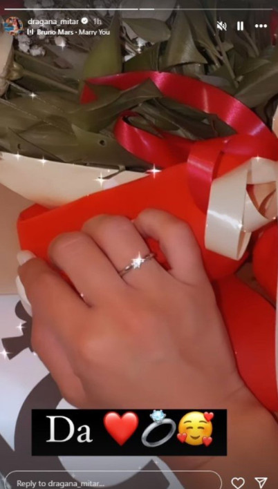 Dragana Mitar redovno deli fotografije na kojima uživa sa svojim partnerom na luksuznim destinacijama, ali njegov identitet vešto krije. Bivša rijaliti učesnica sada je na svom Instagram profilu objavila fotografiju sa velikim buketom ruža, ali i prstenom na ruci, na kojoj je velikim slovima napisala DA.