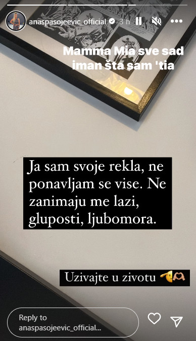 – Ja sam svoje rekla, ne ponavljam se više. Ne zanimaju me laži, gluposti, ljubomora. Uživajte u životu – poručila je Ana putem svog storija.