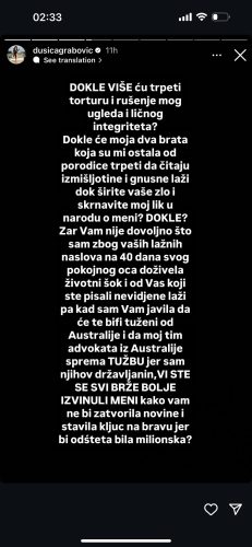 – Pa kad sam vam javila da ćete biti tuženi od Australije i da moj tim advokata iz Australije sprema tužbu jer sam njihov državljanin, vi ste se svi brže-bolje izvinili meni kako vam ne bi zatvorila novine i stavila ključ na bravu jer bi šteta bila milionska – napisala je Dušica i dodala.