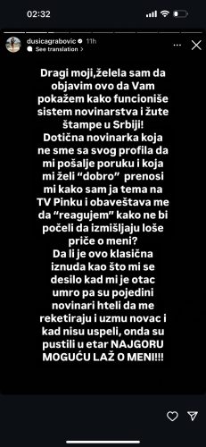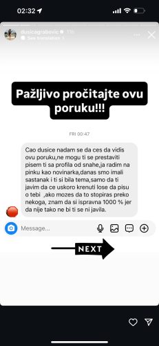 – Ćao Dušice, nadam se da ćeš da vidiš ovu poruku, ne mogu ti se predstaviti. Pišem sa profila tvoje snahe, ja radim na Pinku kao novinarka. Danas smo imali sastanak i ti si bila tema, samo da ti javim da će uskoro početi loše da pišu o tebi. Ako možeš da stopiraš preko nekoga, znam da si ispravna, jer da nije tako, ne bih ti se javila – glasila se poruka koju je Dušica dobila.