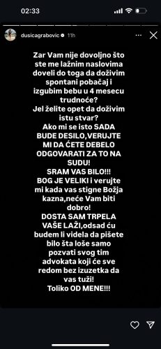 – Zar vam nije dovoljno što ste me lažnim naslovima doveli do toga da doživim spontani pobačaj i izgubim bebu u 4. mesecu trudnoće? Jel želite opet da doživim istu stvar? Ako mi se isto sada bude desilo, verujte mi da ćete debelo odgovarati za to na sudu. Sram vas bilo, Bog je veliki i verujte mi, kad vas stigne Božja kazna, neće vam biti dobro. Dosta sam trpela vaše laži, odsad ću, budem li videla da pišete bilo šta loše, pozvati svoj tim advokata koji će sve redom bez izuzetka da vas tuži – završila je Dušica.