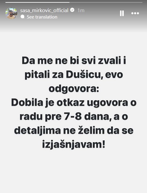 – Da me ne bi svi zvali i pitali za Dušicu, evo odgovora: Dobila je otkaz ugovora o radu pre 7 – 8 dana, a o detaljima ne želim da se izjašnjavam – piše Mirković na svom instagram profilu.