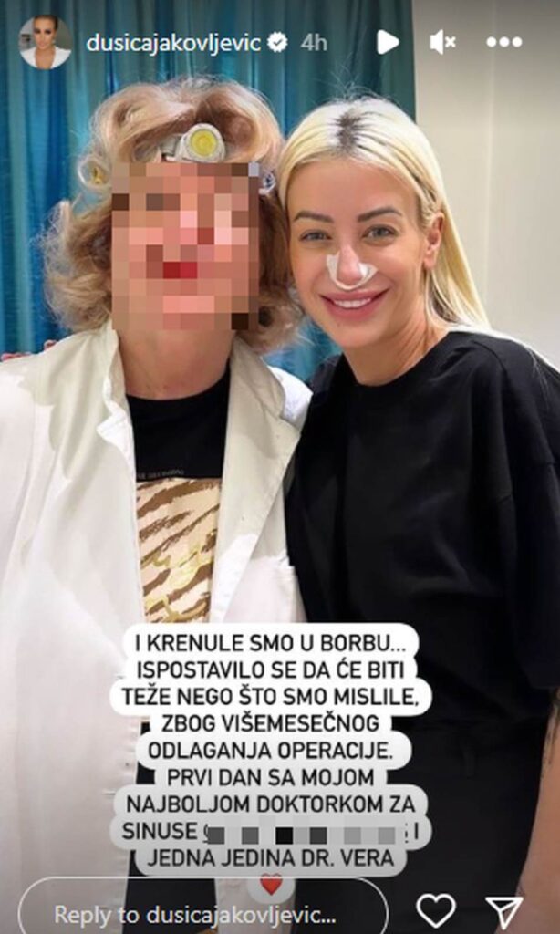 Voditeljka Dušica Jakovljević, koju godinama unazad gledamo kao „zaštitno lice“ Zadruge, nakon grudi, zuba i usni, imala je još jednu intervenciju na sebi zbog koje se usijao Instagram. Ovaj put Dušica je pod nož išla iz zdravstvenih, a ne estetskih razloga. Ovog puta je sređivala sinuse, a od završetka Zadruge do danas išla je na četiri intervencije, dok je sledeće nedelje očekuje peta.