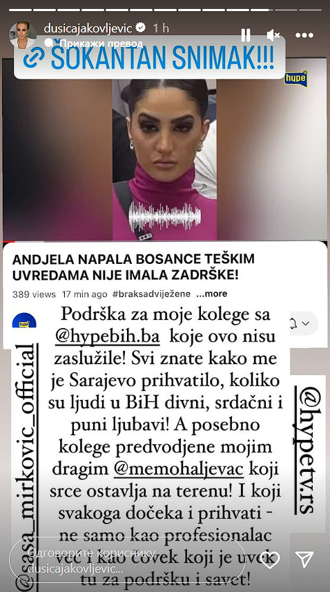 – Podrška za moje kolege sa Hype BIH koje ovo nisu zaslužile! Svi znate kako me je Sarajevo prihvatilo, koliko su ljudi u BIH divni, srdačni i puni ljubavi! A posebno kolege predvođene mojim dragim Memom Haljevcem koji srce ostavlja na terenu! I koji svakoga dočeka i prihvati – ne samo kao profesionalac već i kao čovek koji je uvek tu za podršku i savet! – Napisala je Dušica na svom Instagram profilu.