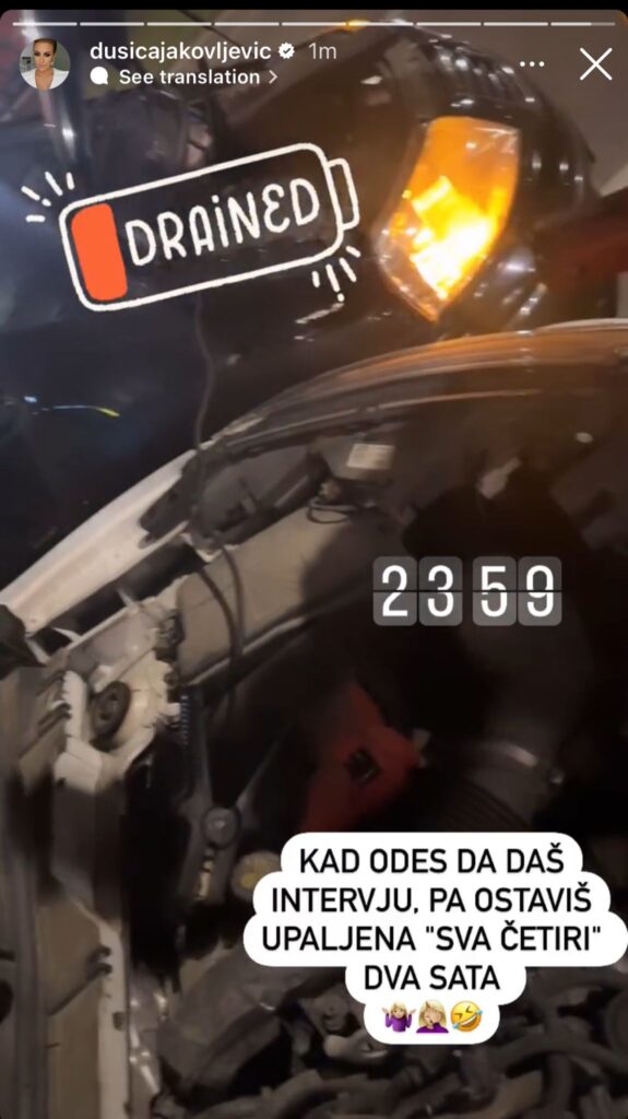 Naime, kako je ona navela u svojoj Instagram objavi, Jakovljevićeva je zaboravila da ugasi sva četiri migavca od svog automobila, te je to dovelo do pražnjena akumulatora, zbog čega nije mogla da ga upali.