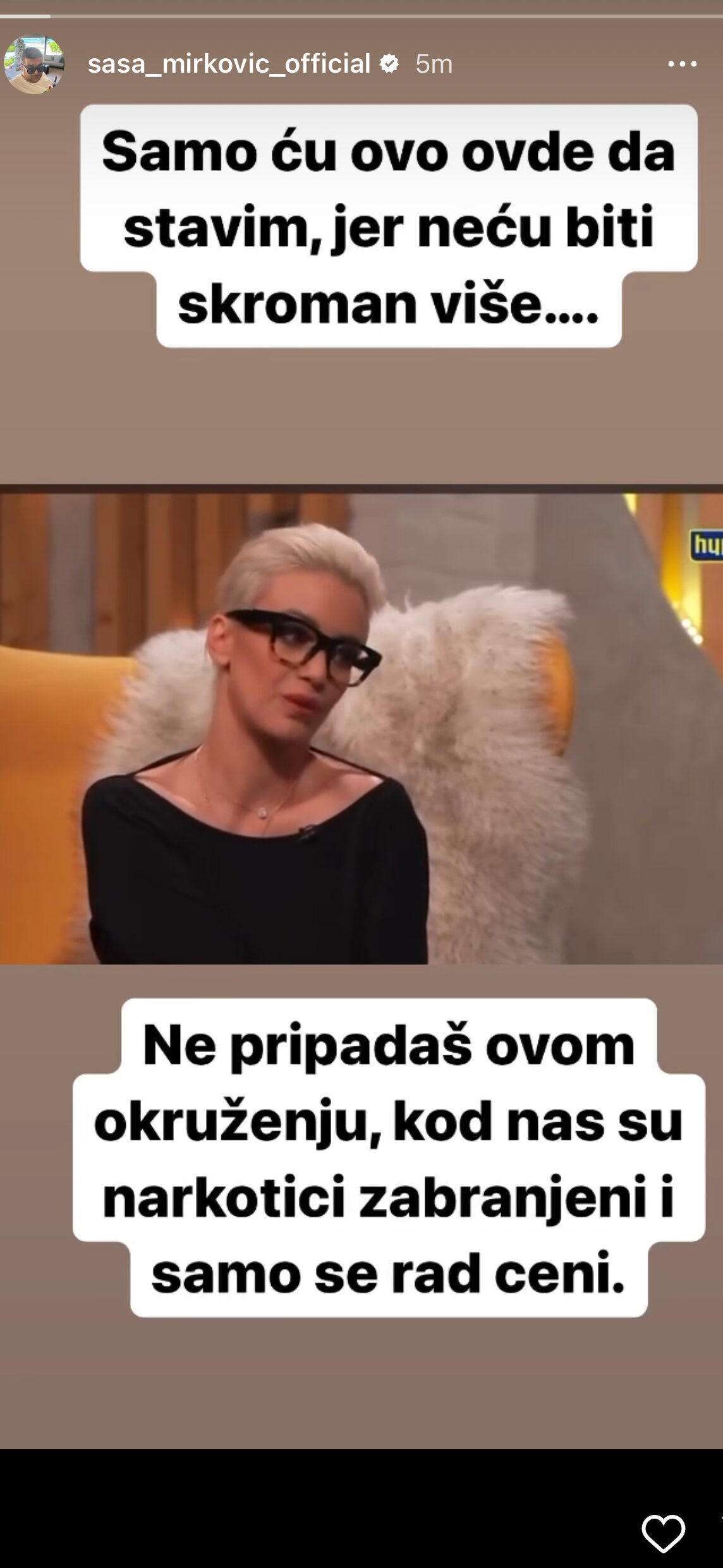 “Samo ću ovo ovde da stavim. Jer neću više skroman biti. Ne pripadaš ovom okruženju. Kod nas su narkotici zabranjeni i samo se rad ceni”. napisao je Mirković.