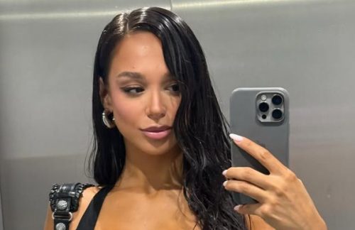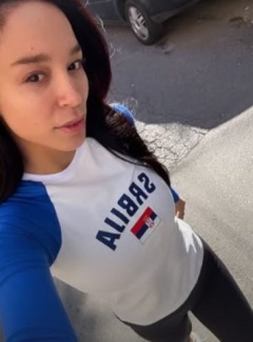 Na slici Edita pozira na dnevnom svetlu, u ležernoj kombinaciji majice sa natpisom „Srbija“ i crnih helanki.
