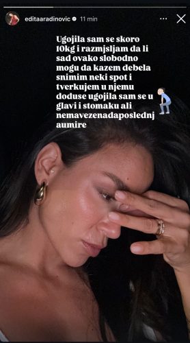 – Ugojila sam se skoro 10 kilograma i razmišljam da li sad ovako slobodno mogu da kažem debela snimim neki spot i tverkujem u njemu. Doduše, ugojila sam se u glavi i stomaku, ali nema veze, nada poslednja umire – napisala je Edita.