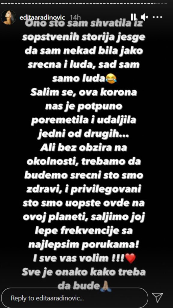 – Ono što sam shvatila iz sopstvenih storija jeste da sam nekad bila jako srećna i luda, sad sam samo luda. Šalim se, ova korona nas je potpuno poremetila i udaljila jedne od drugih… Ali bez obzira na okolnosti, treba da budemo srećni što smo zdravi, i privelegovani što smo uopšte ovde na ovoj planeti. Šaljimo joj lepe frekvencije sa najlepšim porukama! I sve vas volim!!! Sve je onako kako treba da bude – napisala je pevačica.