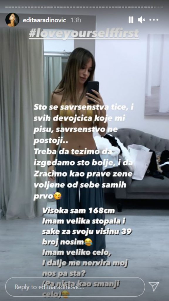 Aradinovićeva je u sledećem Insta storiju istakla da je bitno voleti sebe prvo uz svoj selfi u ogledalu.