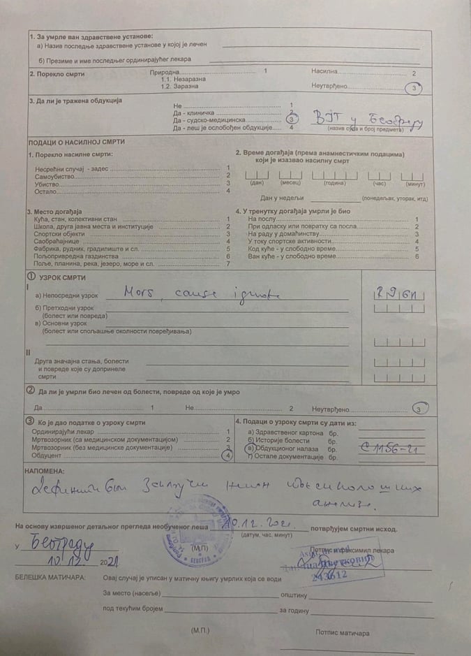 Uz ovaj izveštaj koji dostavljamo vama, patrijaršija će odobriti opelo, ali nažalost, molba se šalje poštanskim pismom i neće stići na vreme, odnosno do termina sahrane koji je u utorak u 13h.