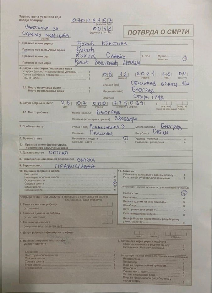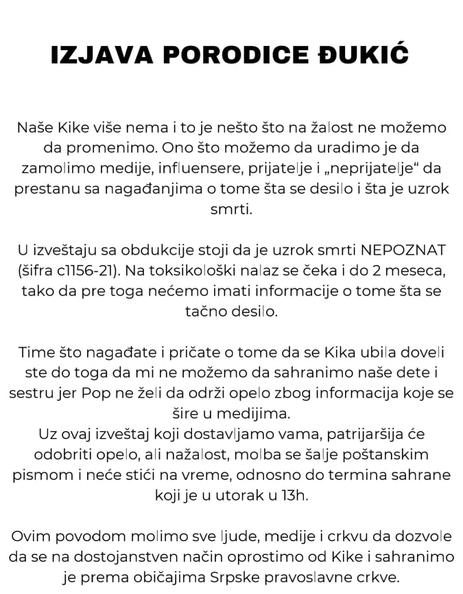 U izveštaju sa obdukcije stoji da je uzrok smrti NEPOZNAT (šifra c1156-21). Na toksikološki nalaz se čeka i do 2 meseca, tako da pre toga nećemo imati informacije o tome šta se tačno desilo. Time što nagađate i pričate o tome da se Kika ubila doveli ste do toga da mi ne možemo da sahranimo naše dete i sestru jer Pop ne želi da održi opelo zbog informacija koje se šire u medijima.