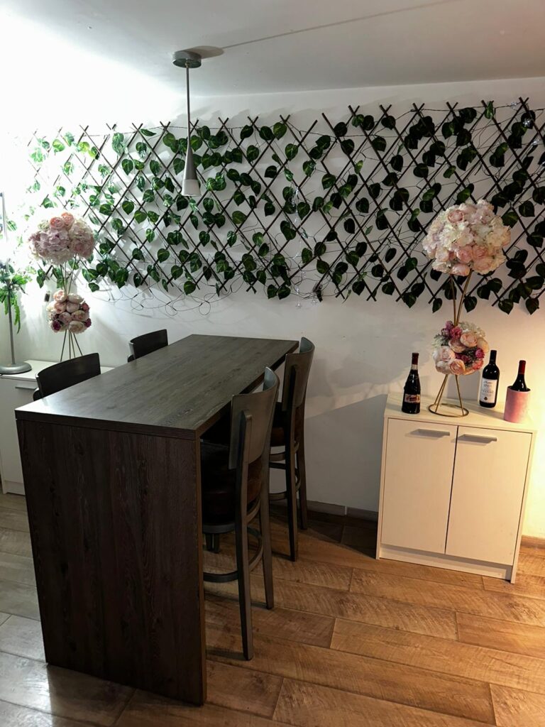 Iz prostrane kuhinje izlazi se u trpezariju, koju krasi mali trpezarijski sto, taman za majku i ćerku. Dok je zid između kuhinje i trpezarije veštačkom zelenom lozicom, kako bi ambijent bio prijatniji. Ono što pevačica mnogo voli jeste cveće, pa se svuda po stanu nalaze glamurozni cvetni arnžmani u puderastoj boji.