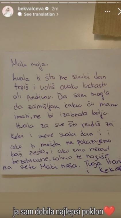– Hvala za sve što radiš za Keti i mene svaki dan. Iako ti možda ne pokazujemo baš često, iako smo nekad bezobrazne volimo te najviše na svetu Maki naša. Tvoje Hana i Ketica – stoji u čestitki.