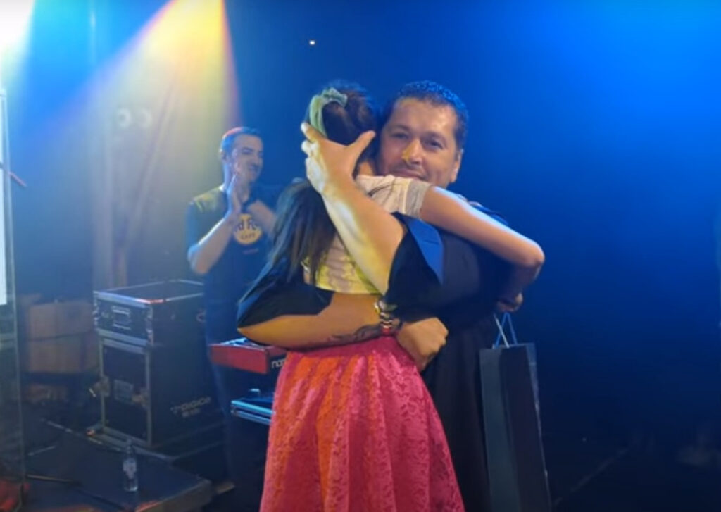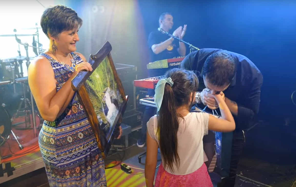 Aco je podigao malenu Almiru u naručje, zagrlio je, a ona i njena majka su mu doneli i mali znak pažnje kao zahvalnost za sve što je učinio za njih i njihovu porodicu.