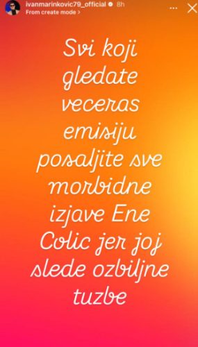 „Svi koji gledate večeras emisiju pošaljite sve morbidne izjave Ene Čolić jer joj slede ozbiljne tužbe“, napisao je Marinković.