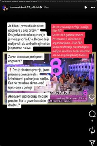 – Ovo je direktna pretnja, javno priznanje povezanosti s kriminalom i pozivanje na nasilje. Ona ne zaslužuje ekran – već ispitivanje u policiji. Ako ovakvi ljudi dobijaju medijski prostor, šta to govori o našem društvu? Javno izazivanje mržnje i nasilja – član 317. Kazna: do 5 godina zatvora. Povezanost s kriminalnim organizacijama – član 346. Samo izražavanje da sarađuješ s mafijom ili se time hvališ može biti osnova za policijsko ispitivanje – istaknuto je povodom svega što je izgovorila Ena Čolić.