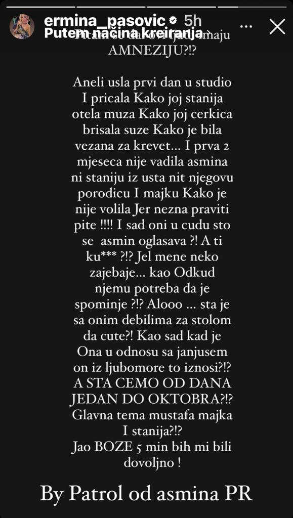 – Pitam se da li ovi ljudi imaju AMNEZIJU!?! Aneli ušla prvi dan u studio i pričala kako joj Stanija otela muža, kako joj ćerkica brisala suze, kako je bila vezana za krevet… I prva 2 meseca nije vadila Asmina ni Staniju iz usta, nit njegovu porodicu i majku. Kako je volela jer ne zna praviti pite!!!! I sad oni u čudu što se Asmin oglašava?! A ti ku***!?! Jel mene neko zajebaje… Kao otkud njemu potreba da je spominje?!? Alooo… šta je sa onim debilima za stolom da ćute!?! Kao sad kad je ona u odnosu sa Janjušem on iz ljubomore to iznosi?!? A ŠTA ĆEMO OD DANA JEDAN DO OKTOBRA?!? Glavna tema Mustafa, majka i Stanija?!? Jao BOŽE 5 minuta bi mi bilo dovoljno! By Patrol od Asmina PR – napisala je Ermina u svojoj objavi na Instagramu.
