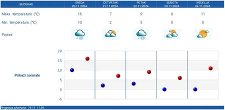 Intenzivnije padavine u trećoj dekadi novembra su moguće, osim sada u petak i 28. i 30. novembra. U periodu od 26. do 30. novembra duvaće umerena do jaka košava.