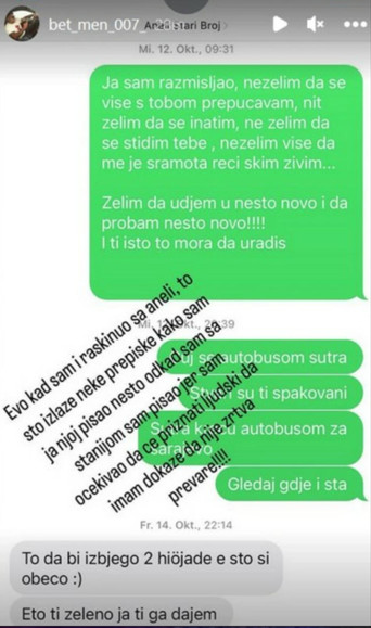 – Tako da, Stanija, ne lupetaj gluposti govoreći da on sa njom nije živeo ni u vanbračnoj zajednici. Da li imaš barem jedan gram mozga?! – zaključuje se u opisu uz prepisku koju možete pročitati u nastavku.Sa druge strane, Asmin je objavio drugu prepisku, ističući da je sa Ahmićevom raskinuo 12. oktobra, uz opis: „Evo kada sam raskinuo sa Aneli. To što izlaze neke prepiske kako sam ja njoj pisao nešto otkad sam sa Stanijom, pisao sam jer sam očekivao da će priznati ljudski da imam dokaze da nije žrtva prevare.“