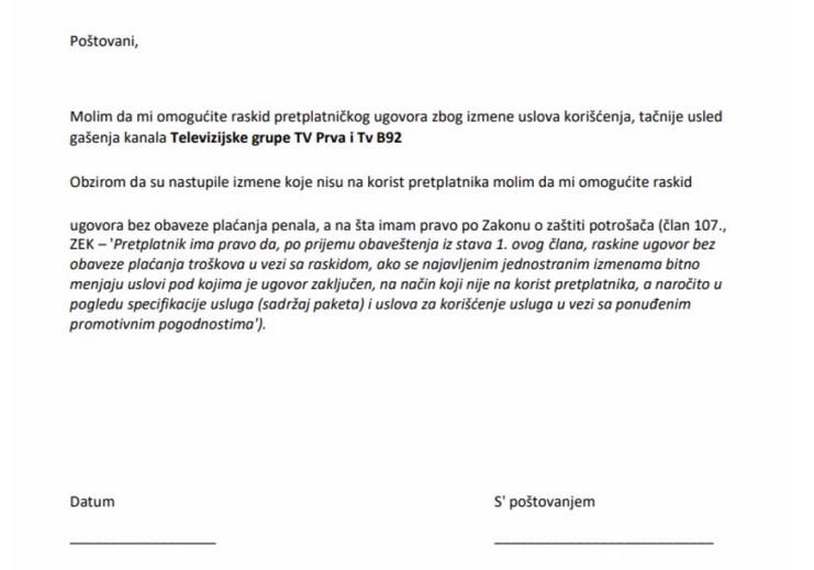 S obzirom na to da su nastupile izmene pod kojima se menja sadržaj paketa za koji sam zaključio ugovor br _________, i izmene nisu na moju korist, da ste propustili da obavestite, najmanje 30 dana unapred, o nameri da bitno promenite uslove pod kojim je ugovor zaključen, što uključuje i ponudu programske šeme na osnovu koje sam se opredelio za _______ paket i da vaše obaveštenje nije sadržalo pouku o pravu na raskid zbog bitne promene uslova pod kojima je ugovor zaključen, molim da mi omogućite raskid bez obaveze plaćanja penala, a na šta imam pravo po Zakonu o zaštiti potrošača.