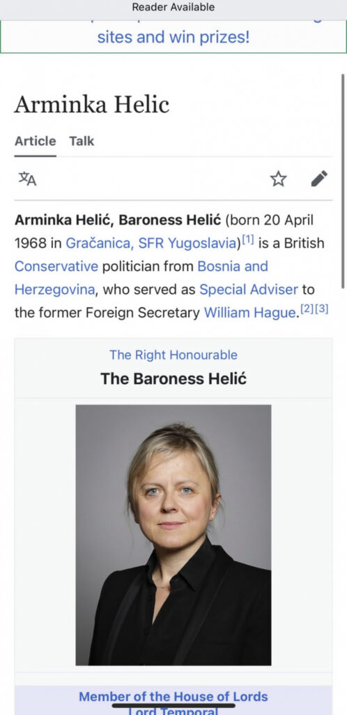 Radi se o Arminki Helić, muslimanki sa političkom funkcijom u Velikoj Britaniji, baronesi, koja zastupa tezu da ne samo da je u Srebrenici počinjen genocid, već da je za to odgovoran CEO SRPSKI NAROD.