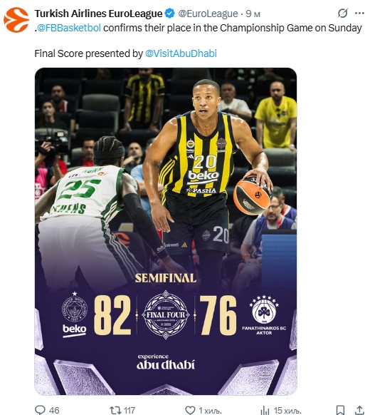 Košarkaši Fenerbahčea su u finalu Evrolige, pošto u u prvom polufinalu savladali evropskog prvaka Panatinaikosa sa 82:76. Turski tim će se boriti za pehar Starog kontinenta.