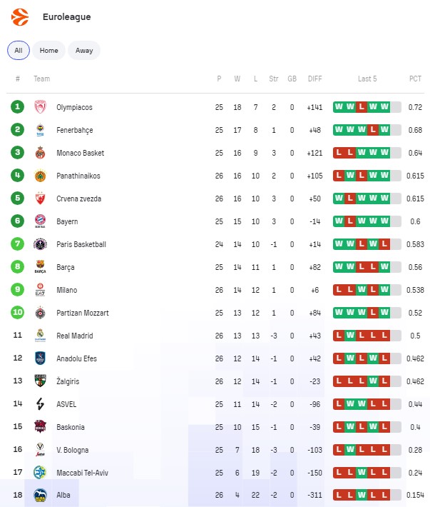 Olimpija Milano je deveta na tabeli Evrolige sa 14 pobeda i 12 poraza, dok je Žalgiris na 13. poziciji sa skorom 12/14.
