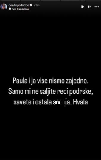 „Paula i ja više nismo zajedno. Samo mi ne šaljite reči podrške, savete i ostala s***a. Hvala“, napisao je Filip na svom Instagram profilu.