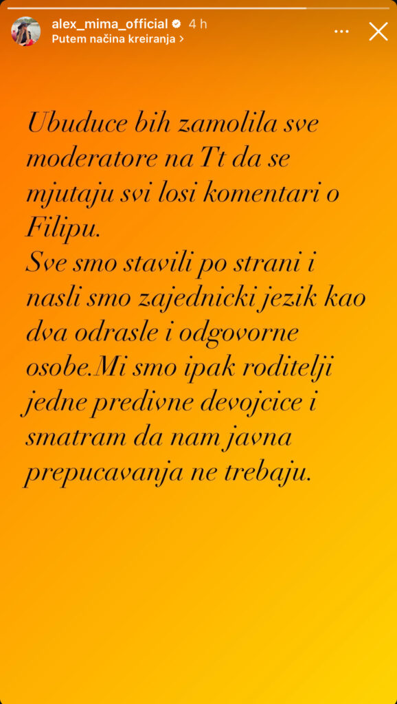 “Ubuduce bih zamolila sve moderatore na Tt da se mjutaju sei losi komentari o Filipu. Sve smo stavili po strani i nasli smo zajednicki jezik kao dva odrasle i odgovorne osobe. Mi smo ipak roditelji jedne predivne devojcice i smatram da nam javna prepucavanja ne trebaju.” Napisala je Aleks.