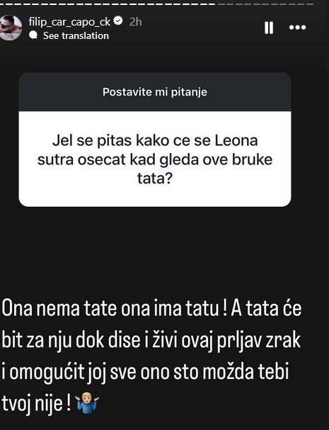 Je l’ se pitaš kako će se Leona sutra osećati kada gleda ove bruke tata? – glasilo je jedno od pitanja, na koja je u svom stilu odgovorio: