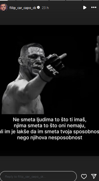 „Ne smeta ljudima to što ti imaš, njima smeta što oni nemaju, ali im je lakše da im smeta svoja sposobnost, nego njihova nesposobnost“, pisalo je u objavi Cara. Na fotografiji boksera koji pokazuje srednji prst.