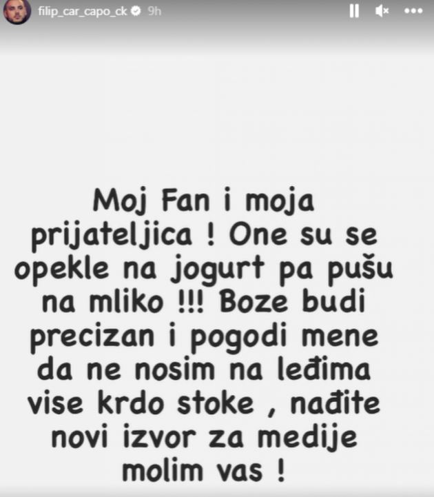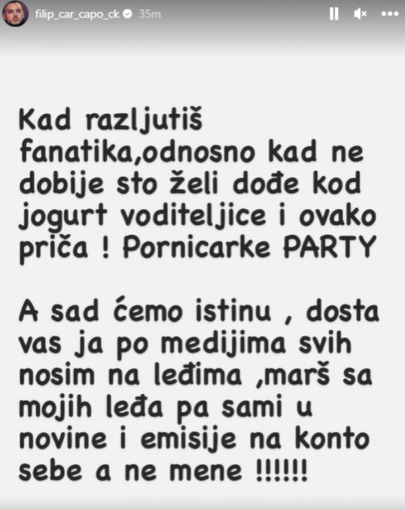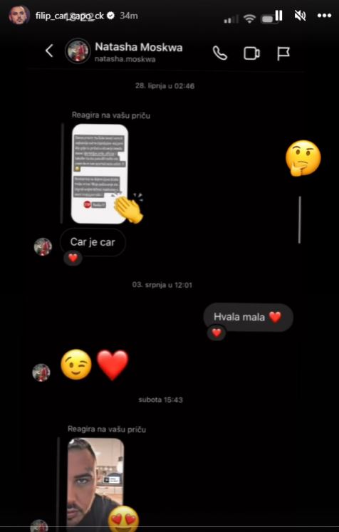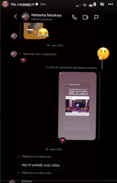 – Kad razljutiš fanatika, odnosno kad ne dobije šta želi dođe kod jogurt voditeljke i ovako priča. A sad ćemo istinu, dosta vas ja po medijima sve nosim na leđima, marš sa mojih leđa pa sami u novine i emisija akonto sebe, a ne mene. – napisao je vidno besan i izrevoltiran Filip, uz skrinšotove pomenute prepiske sa Natašom Moskvom.