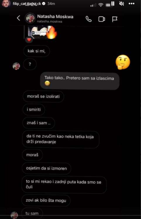 Nakon što su privatne prepiske između starlete Nataše Moskve i Filipa Cara dospele u žižu javnost, sada se on oglasio i izneo svoju stranu priče, a uz sve to obelodanio i njihove poruke.