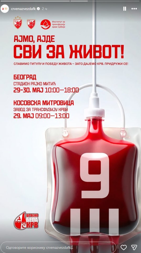 – Rezerve krvi su ponovo na minimumu, a nekome krv zaista znači život! Zvezdaši, ovo nam je nova prilika da još jednom, po ko zna koji put, pokažemo humanost, doniramo najvrednije, krv i pružimo pomoć građanima Srbije, kojima je to potrebno – navodi se u saopštenju.