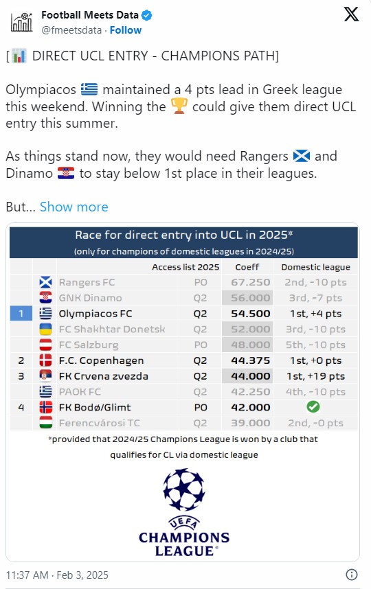 Od timova koji imaju bolji koeficijent od kluba sa stadiona „Rajko Mitić“, trenutno su jedino Olimpijakos i Kopenhagen lideri u svojim zemljama, a planove bi mogao da pokvari zagrebački Dinamo koji ima pet bodova manje od splitskog Hajduka i nikako ga ne treba otpisati u trci za šampionski tron u Hrvatskoj.