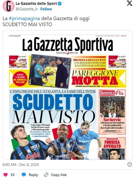 – Milan slavi 125 godina postojanja. To je beskrajna priča ispunjena zvezdama i crno-crvenim prugama. I golovima. Statističari preciziraju i ažuriraju podatke: sa golom Morate protiv Atalante, ukupno je postignuto 7743 golova u svim zvaničnim takmičenjima, uključujući ratne šampionate. A najlepši gol? Ljudi, zavežite pojaseve, sada letimo kroz nebesa i pakao.