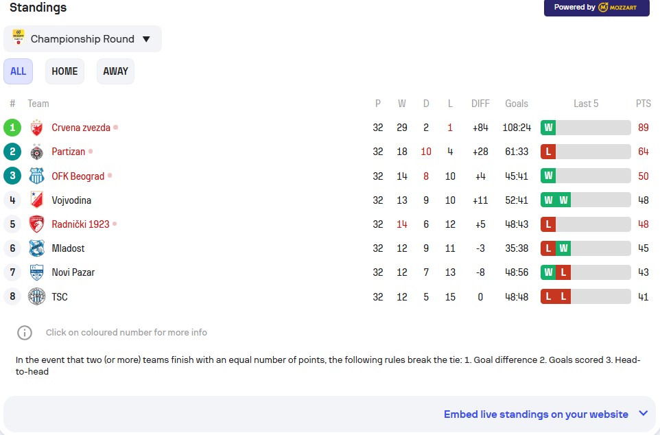 Partizan je ostao drugi sa 64 boda, dok je OFK Beograd na trećoj poziciji sa 53 poena.