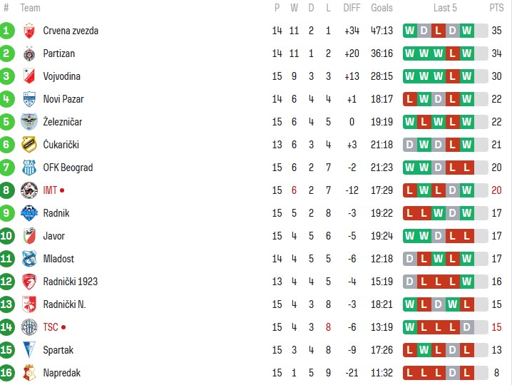 Crveno-beli su se vratili na čelo tabele sa 34 boda, imaju 11 pobeda, dva remija i jednim porazom, a Subotičani ostaju na pretposlednjem 15. mestu Superlige, sa samo 13 poena na kontu.