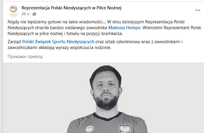 – Nikada nećemo biti spremni za ovakve vesti. Poljska reprezentacija gluvih je izgubila vrlo predanog igrača Mateuša Hempea, koji je godinama bio i futsal golman – napisali su oni kratko.