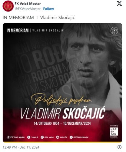 Legendarni fudbaler Veleža iz Mostara, Vladimir Skočajić, preminuo je u sredu u 70. godini, kako je preneo klub.