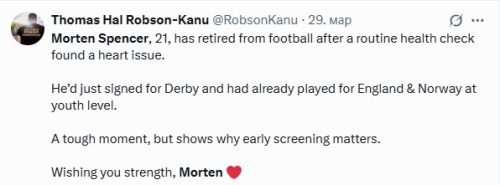 Mladi fudbaler Morten Spenser, objavio je da je prinuđen da završi karijeru iako ima tek 21 godinu. On je otkrio da zbog zdravstvenih problema ne može da nastavi da se bavi fudbalom.