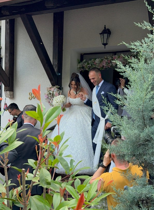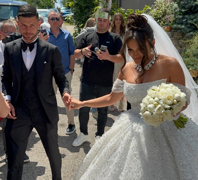 Mlada je ispred kuće i zaigrala, a onda su seli u luksuzni automobil koji su iznajmili specijalno za ovu priliku. Međutim, pri ulasku u auto pevačica je imala malih poteškoća, jer je haljina poprilično dugačka pa je čak troje moralo da joj pomogne da se spakuje na zadnje sedište. Naravno i mladoženja je bio jedan od njih. Ko da je želeo da što pre krenu ka Hramu Sveti Sava gde će biti venčanje, ali i krštenje njihove ćerkice.