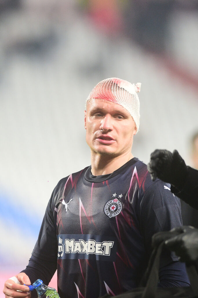 Fudbaleru Partizana, Nikoli Antiću, slučajnim udarcem razbijena je glava na 174. večitom derbiju..