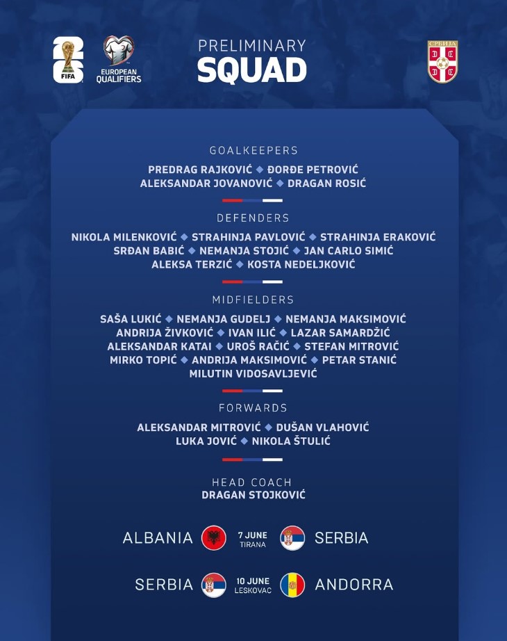Stojković će konačan spisak igrača za mečeve protiv Albanije i Andore da objavi u petak, 30. maja. Fudbaleri Srbije okupiće se 2. juna u Sportskom centru FSS u Staroj Pazovi.