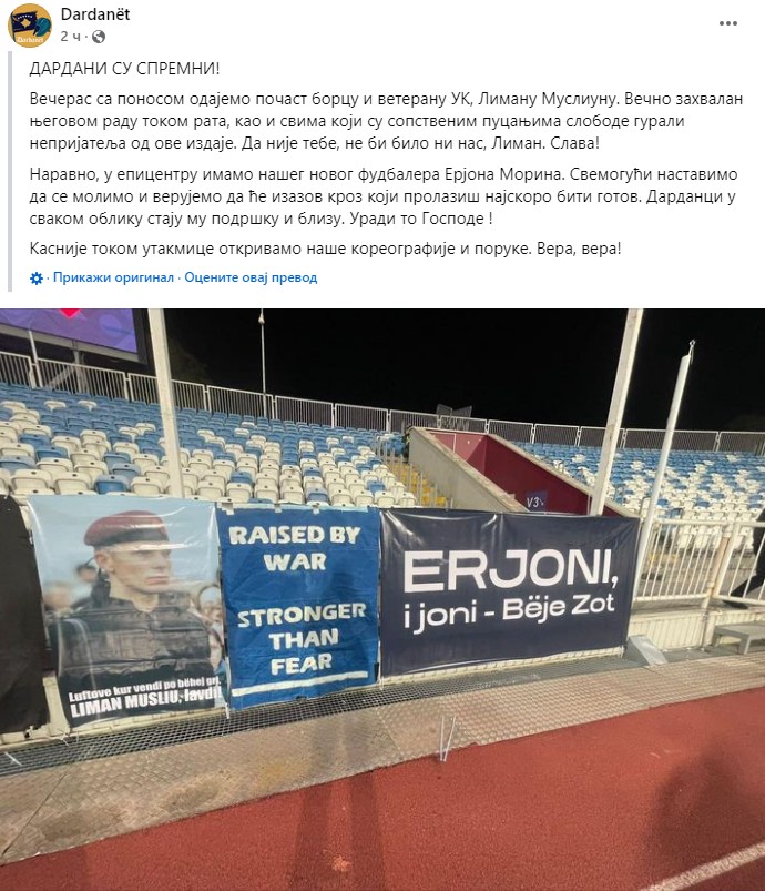 Naime, na ogradi jedne od tribina istaknuta je zastava s likom Limana Muslijua, nekadašnjeg pripadnika OVK i funkcionera tzv. Kosovskih bezbednosnih snaga, koji je tragično stradao prošle subote.